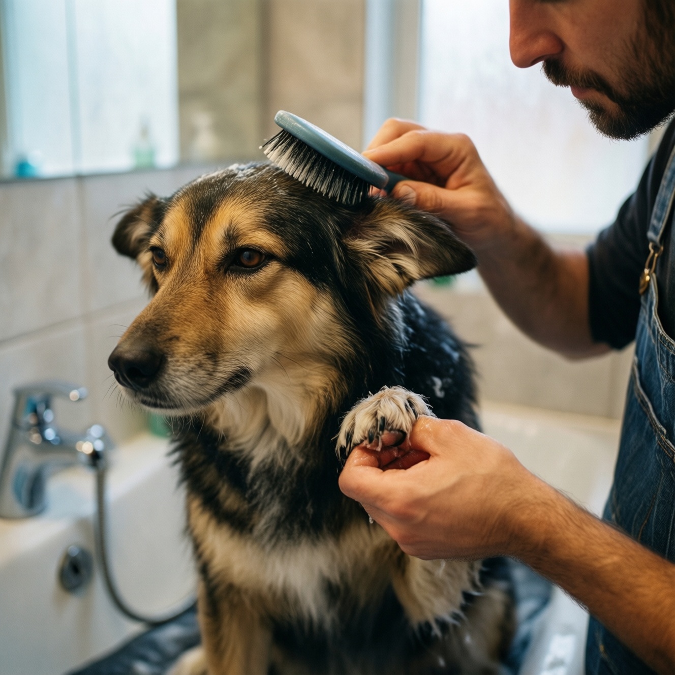 Купание и сушка без перегрева. Мойте тёплой водой, тщательно промачивая шерсть; шампунь разбавляйте и наносите по корпусу, избегая попадания в глаза и слуховой проход. Смывайте дольше, чем кажется нужным, затем полотенце и сушка феном на тёплом (не горячем) режиме, постоянно двигая поток.